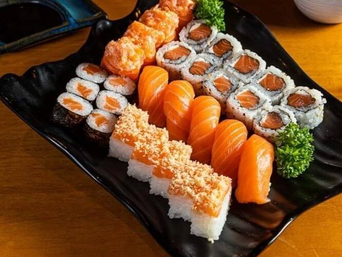 40 pecas / 5 urmaki de salmão cru , 5 uramaki salmão grelhado , 5 hossomaki de salmão ,5 hossomaki de kani ,5 dyo, 5 nigui , 10 unidades de hot holl