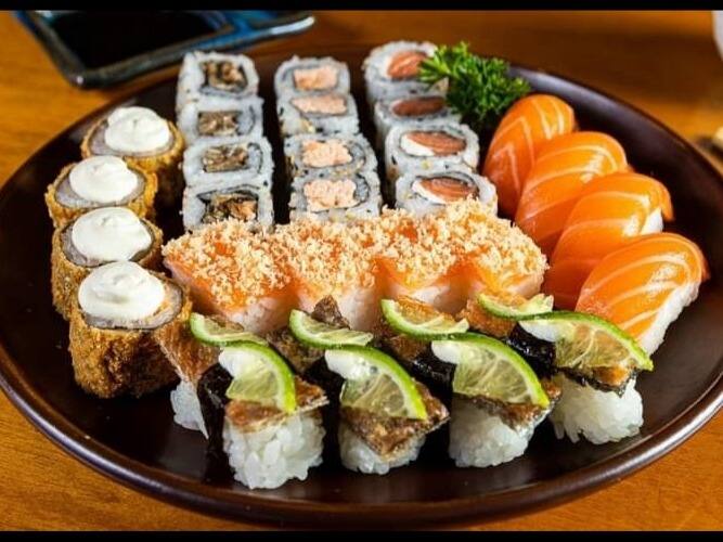 40 pecas / 5 urmaki de salmão cru , 5 uramaki salmão grelhado , 5 hossomaki de salmão ,5 hossomaki de kani ,5 dyo, 5 nigui , 10 unidades de hot holl