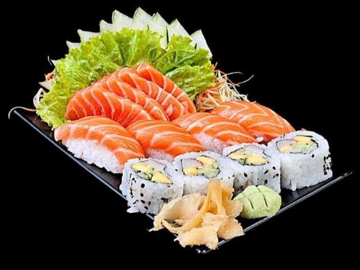 28 pecas/ 4 niguiri skim ,4 niguiri de salmão, 4 batera ,4 urmaki skim , 4 urmaki grelhado , 4uramaki salmão cru , 4 unidades de hot holl