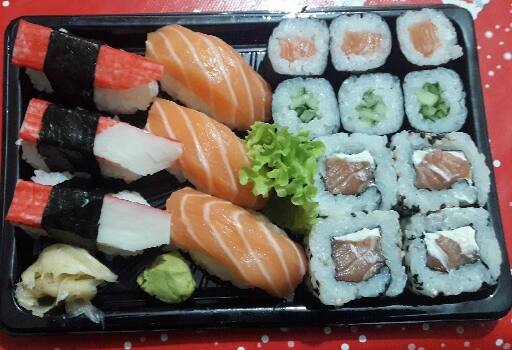 28 pecas/ 4 niguiri skim ,4 niguiri de salmão, 4 batera ,4 urmaki skim , 4 urmaki grelhado , 4uramaki salmão cru , 4 unidades de hot holl