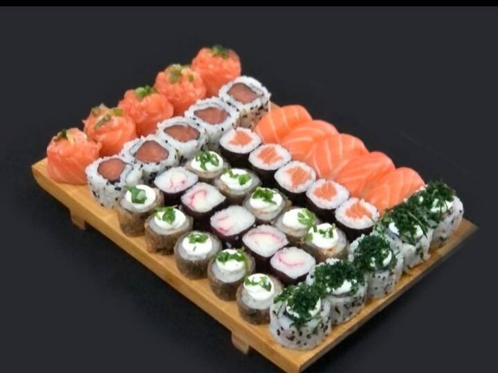 40 pecas / 5 urmaki de salmão cru , 5 uramaki salmão grelhado , 5 hossomaki de salmão ,5 hossomaki de kani ,5 dyo, 5 nigui , 10 unidades de hot holl