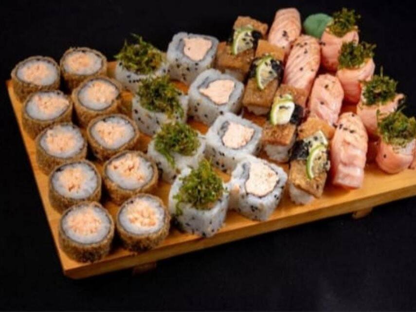 52pecas / 20 hot roll´s ,4 uramaki salmao , 4 uramaki Califórnia , 3 niguiri kani ,3 niguiri Skin ,3 niguiri salmao ,4 batera salmao grelhado ,3 dyo salmão ,4 hossomaki salmao , 2 hossomaki kani ,2 hossomaki pepino. Obs ; os hot roll são recheado de salmao grelhado, cebolinha e cream chisse.