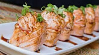 Aneis de salmão cobertos com tartar de salmão batido com cebolinha, e cream chesse