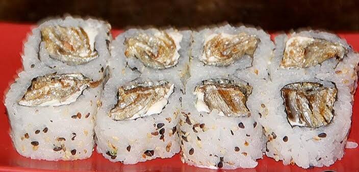 Enrolado com arroz por fora, recheado com salmão e cream chesse