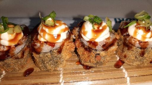 10 unidades de hot holl /recheado com salmão reme chisse / cebolinha/ com toke de molho tare